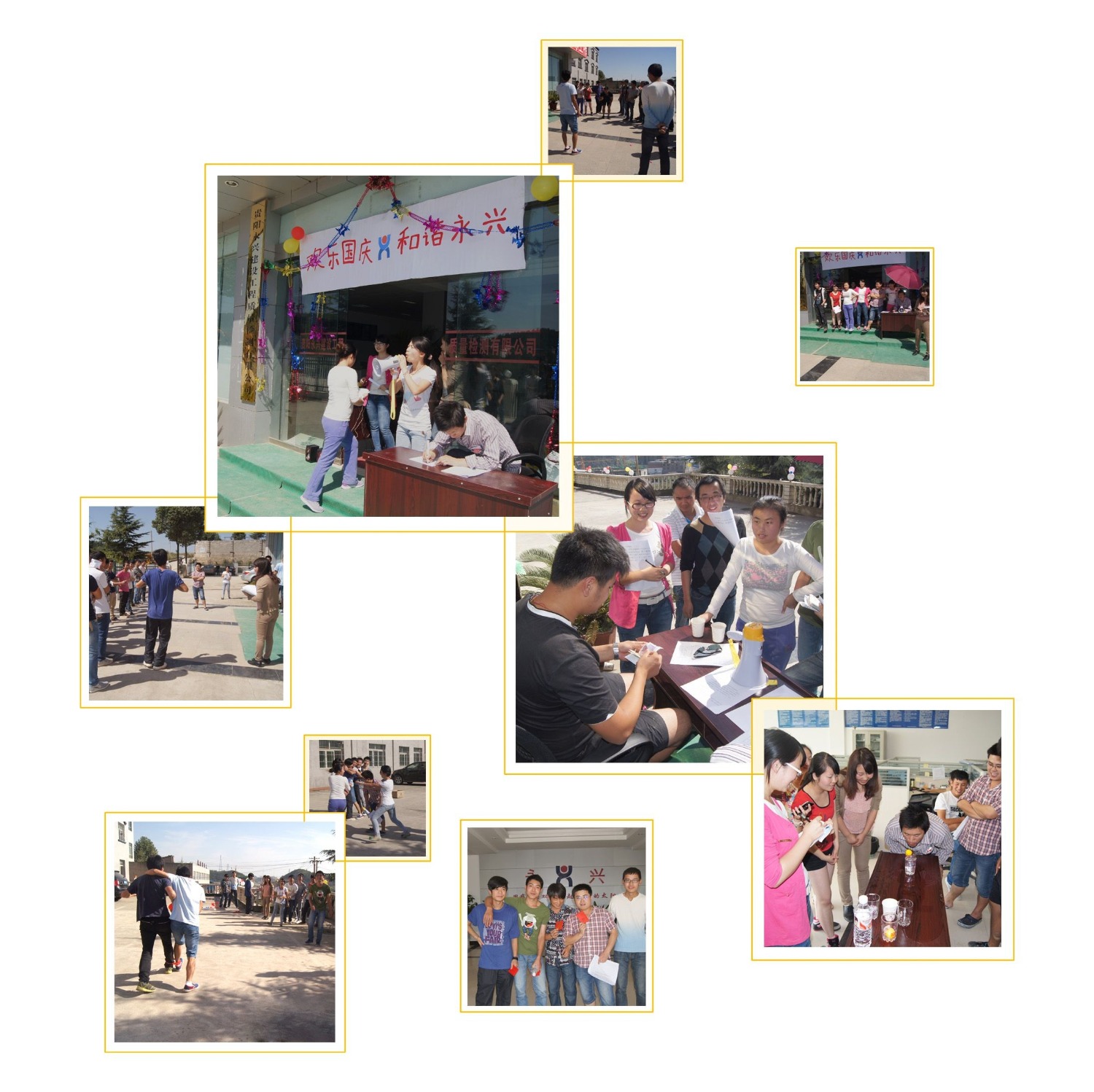 2013年10月1日,是新中国成立64周年华诞,为了弘扬爱国主义精神和集体主义精神,展现公司员工的风采,我公司(永兴建设工程质量检测有限公司)工会于2013年9月30号下午14:00组织开展了“欢乐国庆•和谐永兴”的主题活动,活动得到了公司全体员工的积极响应,活动内容包括各种体育和游戏相结合的比赛项目,本次活动的开展,有效地为公司员工提供了一个展现自我的平台,极大地丰富了员工的业余生活。公司领导在活动中与员工积极交流、互相协作,缩短了员工与领导之间的心理距离,全公司上下笼罩着“庆祝国庆,祝福祖国”的和谐氛围。