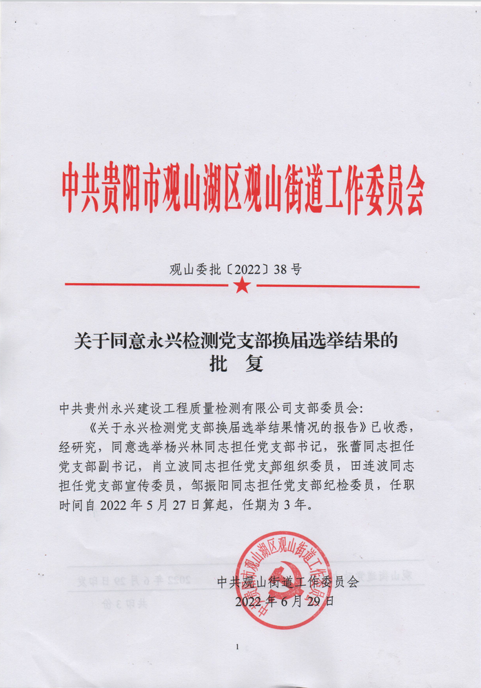 关于同意永兴检测党支部换届选举结果的批复