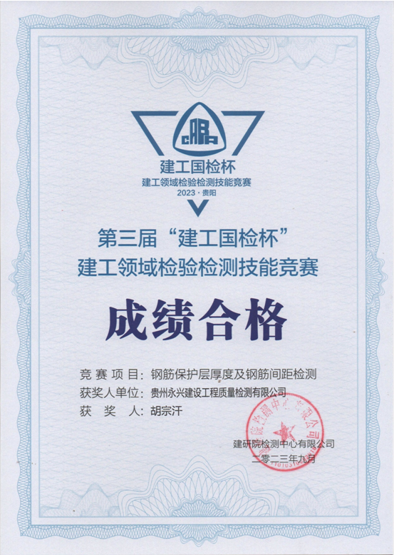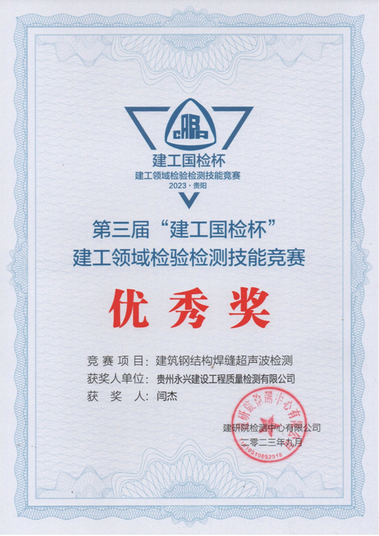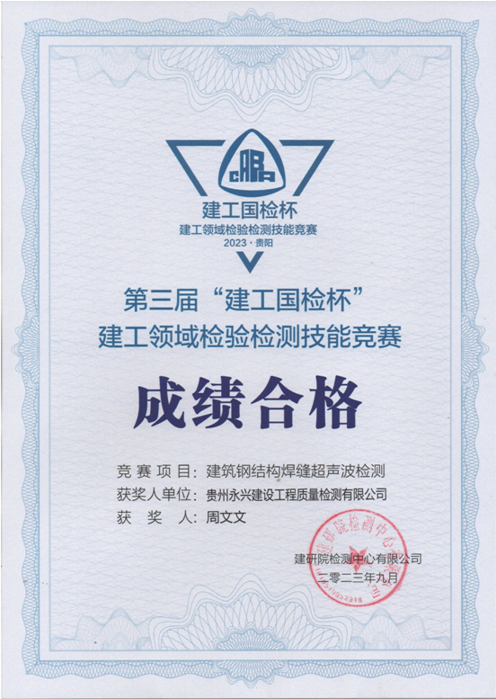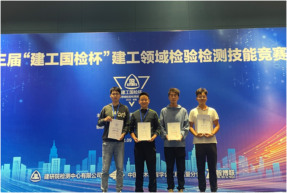 2023年9月14日,由建研院检测中心有限公司和中国土木工程学会工程质量分会联合主办的第三届“建工国检杯”2023年度建工领域检验检测技能竞赛在贵州贵阳举行,本次竞赛项目分别为“结构实体钢筋保护层厚度及间距检测”、“结构实体裂缝深度检测”和“建筑钢结构焊缝超声波检测”三项。经过激烈紧张的角逐,公司轨道交通部瞿广志、结构工程部闫杰不负众望,在全部选手中脱颖而出,分别荣获 “金奖(钢保)”和“优秀奖(焊缝无损)”;结构工程部周文文、胡宗汗也圆满完成了比赛,获得“成绩合格”证书。