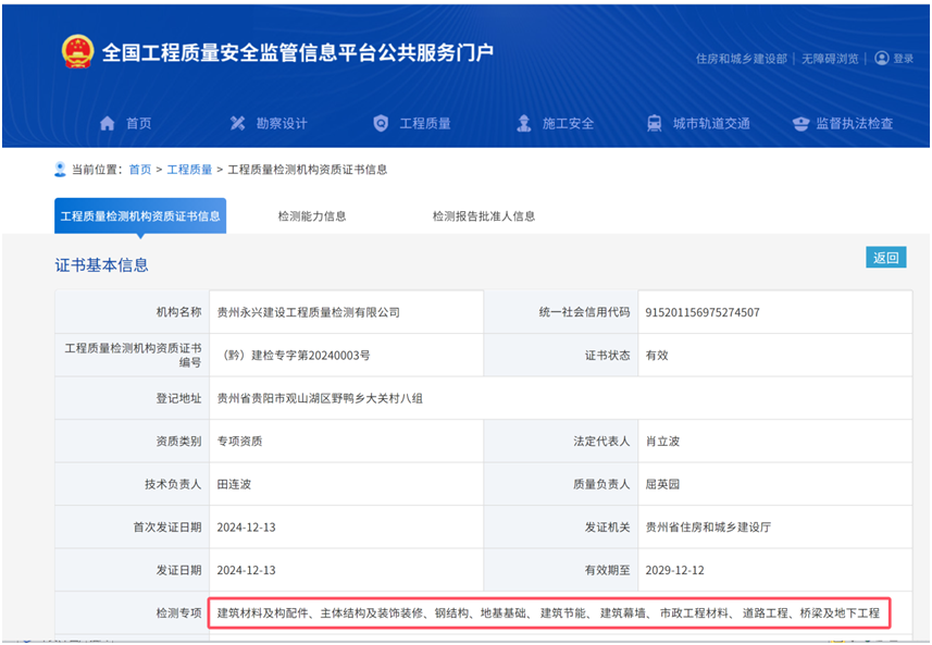 经过一年时间的充分准备,公司于2024年12月13日取得了依据《建设工程质量检测机构资质标准》(建规质〔2023〕1号)重新核定的“建设工程质量检测机构资质证书”,检测专项包括建筑材料及构配件、主体结构及装饰装修、钢结构、地基基础、建筑节能、建筑幕墙、市政工程材料、道路工程、桥梁及地下工程共九个专项,新资质证书的检测范围基本覆盖房屋建筑及市政工程验收检测内容。